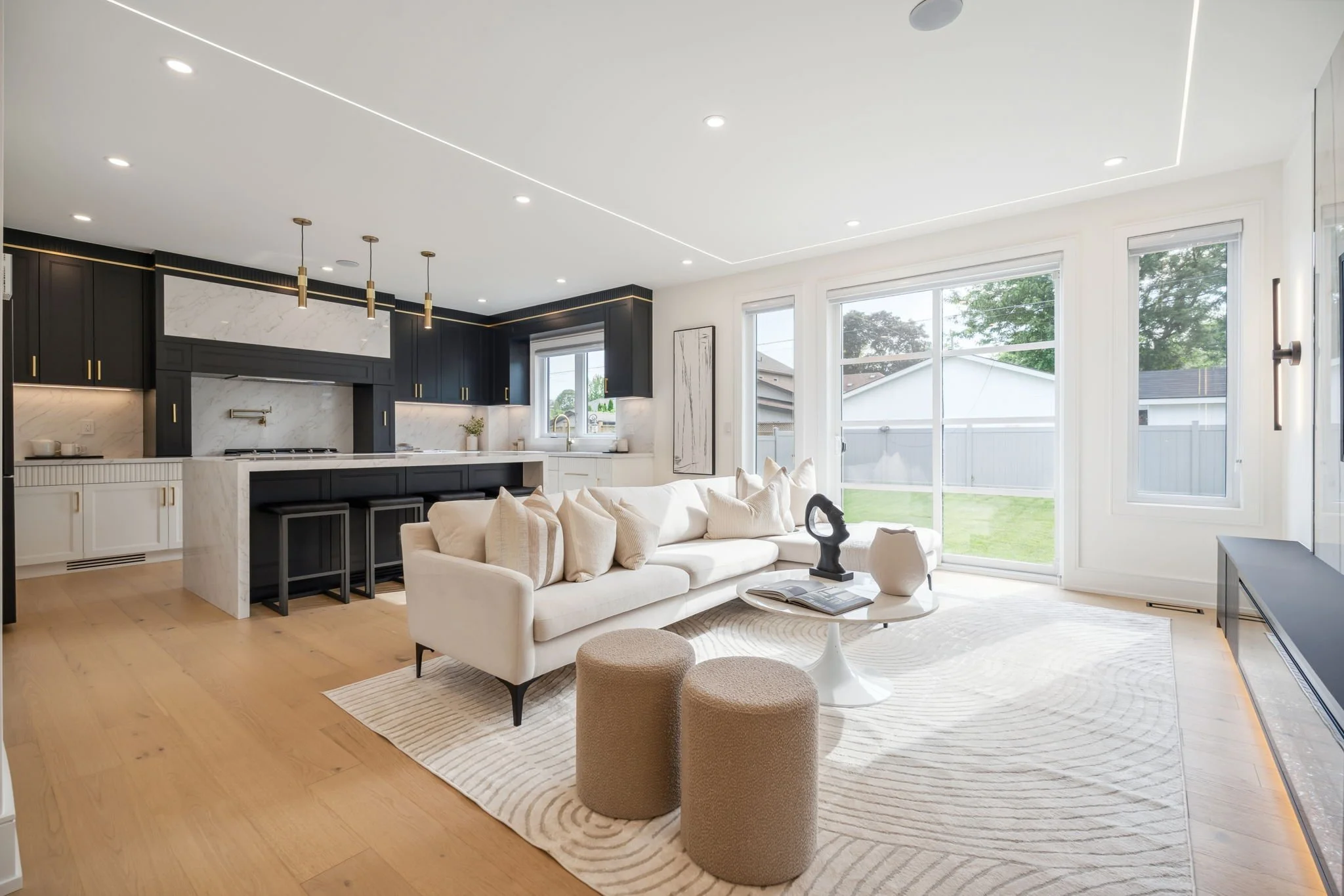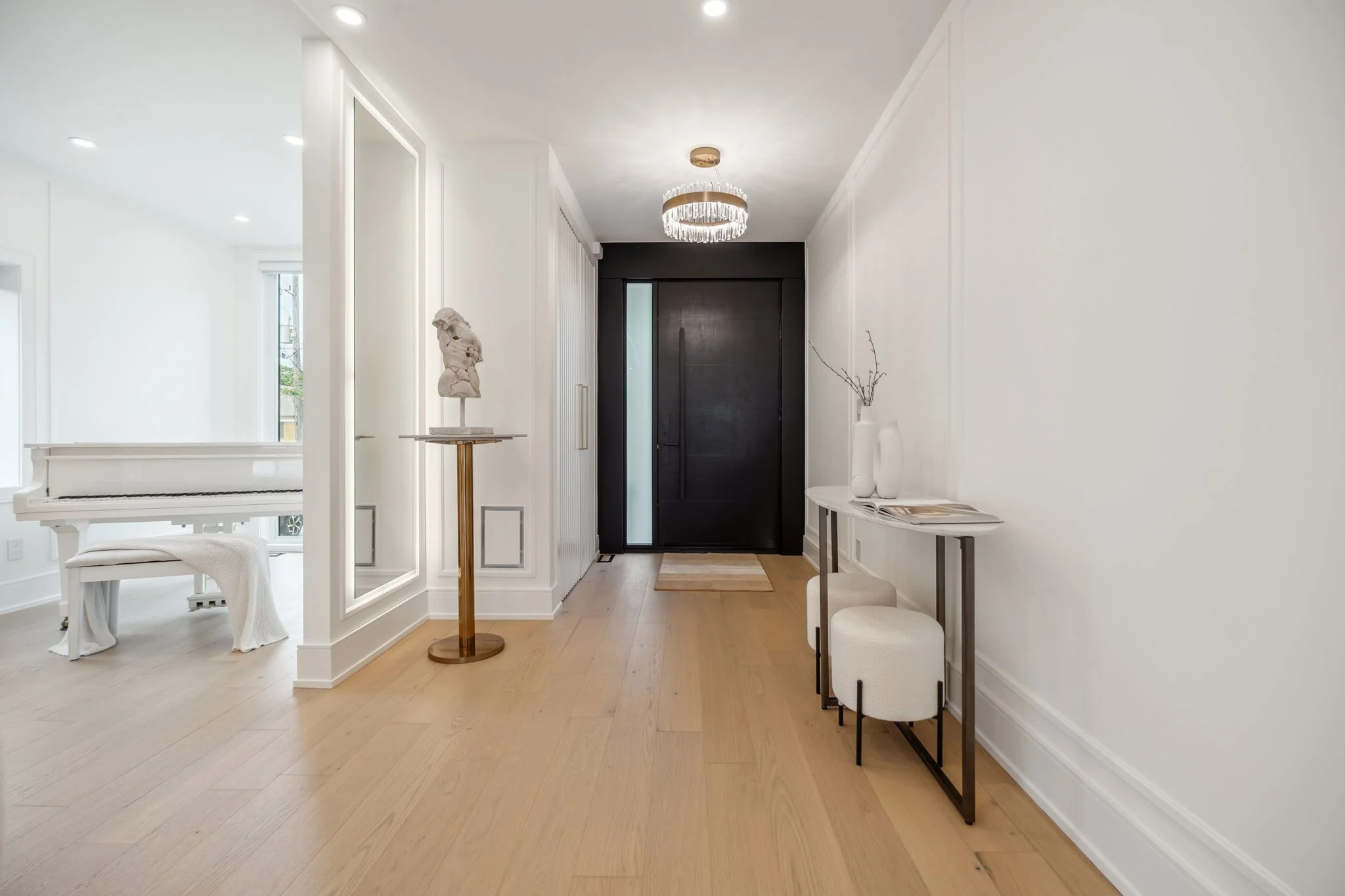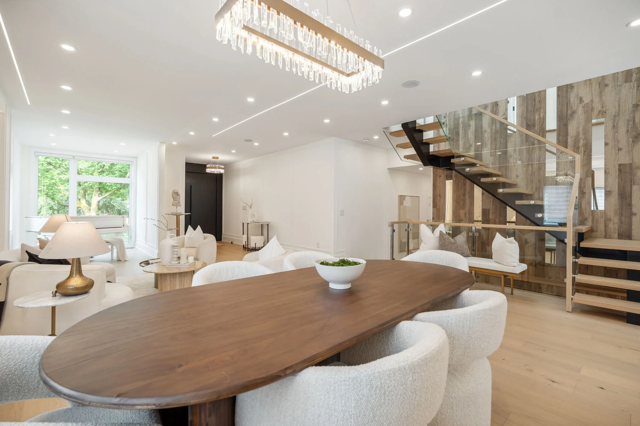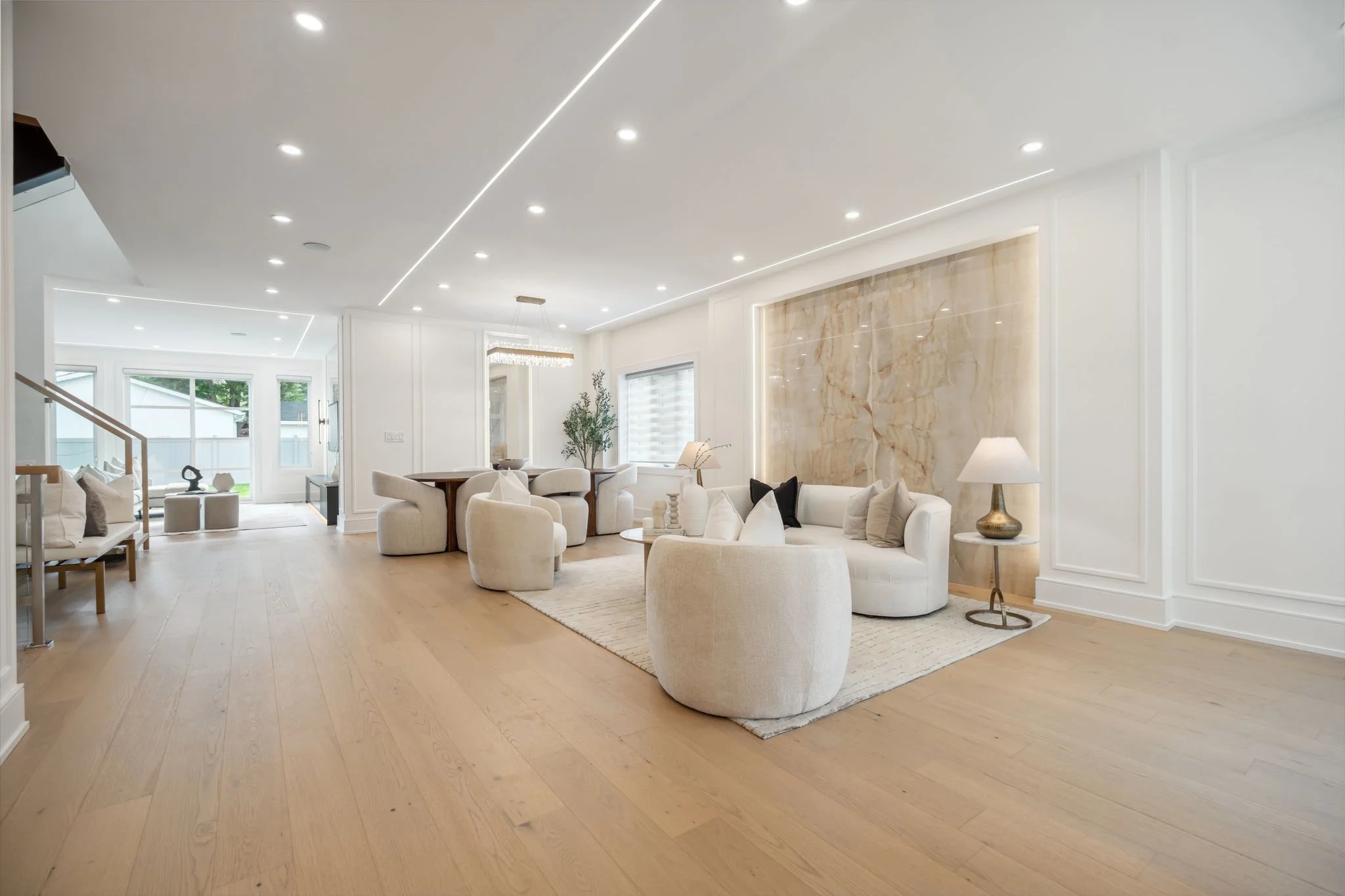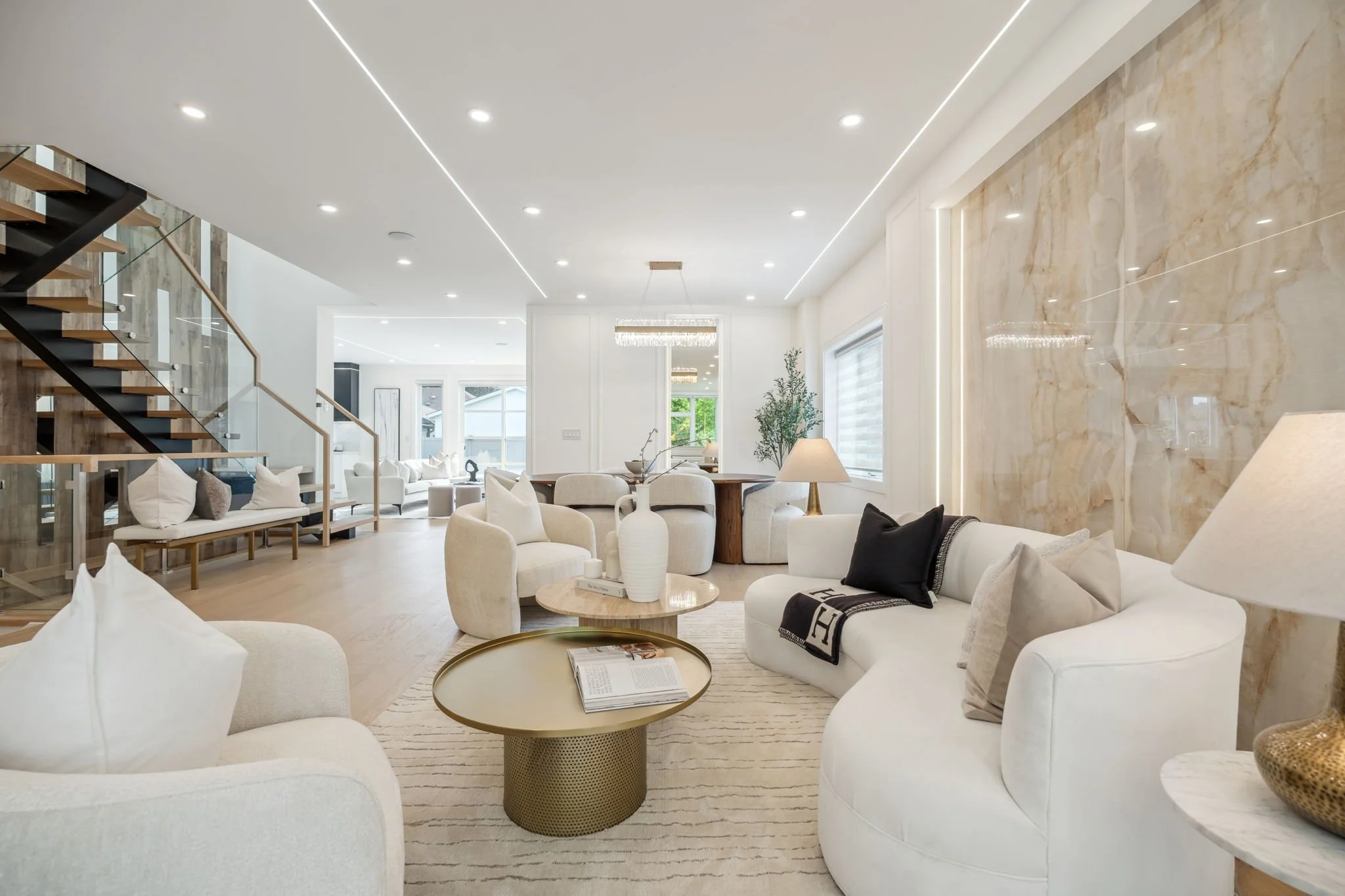 This architecturally designed home redefines luxury living, offering an impressive blend of style, comfort, and function. Boasting 9’ ceilings and rich hardwood flooring throughout, this residence features oversized solid-core wood doors, modern baseboards, LED lighting, pot lights, gorgeous slab walls and built-in surround sound for an elevated living experience.